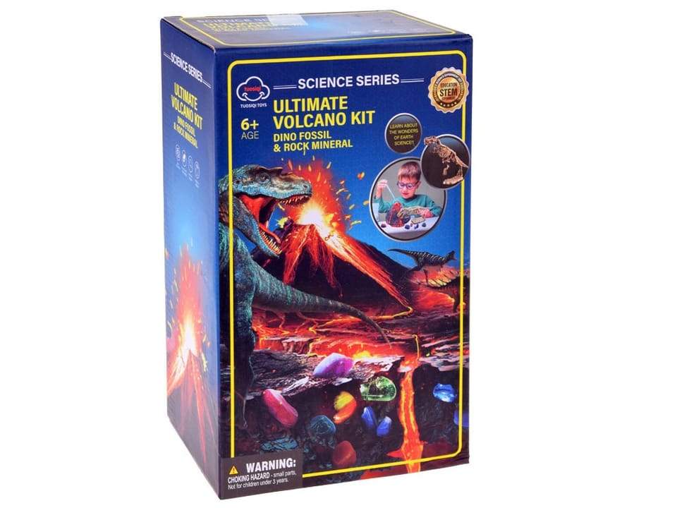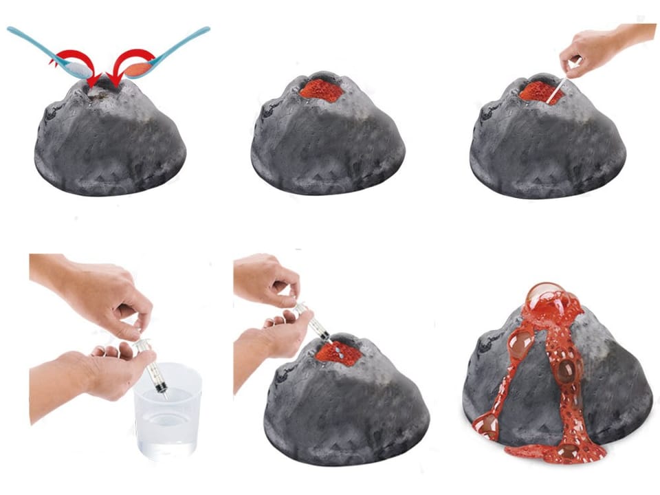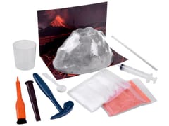 Edukacyjny, kreatywny zestaw stworzony z myślą o dzieciach, które lubią wszelkiego rodzaju zestawy doświadczalne a także fanach dinozaurów. Zestaw łączy w sobie dwie zabawy, dzięki czemu trwa ona jeszcze dłużej. Zabawka idealna dla każdego dziecka, które w przyszłości chciałoby zostać archeologiem lub paleontologiem. Zawartość zestawu:- gipsowy odlew wulkanu, - saszetka kwasu cytrynowego (C6H10O8),- saszetka wodorowęglanu sodu (NaHCO₃),- miarka,- strzykawka, - mieszadełko,- kubeczek miarowy, - młotek, - dłuto,- pędzelek,- tektura z ilustracją wybuchającego wulkanu, - instrukcja obrazkowa (opis w języku angielskim). I Jak wykonać wybuch wulkanu?1. Upewnij się, że odlew gipsowy jest suchy. W kraterze umieść nieco kwasu cytrynowego oraz wodorowęglanu sodu i wymieszaj mieszadełkiem. Im więcej składników wsypiesz, tym mocniejszy efekt zostanie osiągnięty. 2. Nalej wody do kubeczka a następnie napełnij nią strzykawkę. Następnie za pomocą strzykawki umieść wodę w kraterze wulkanu. Rób to ostrożnie, tak, by dłonie nie dotykały odlewu wulkanu. 3. Obserwuj reakcję- pojawią się bąbelki a następnie "lawa" zacznie wypływać z krateru, niczym w prawdziwym wulkanie. UWAGA! Podczas przeprowadzania doświadczenia należy zachować szczególną ostrożność. Wykorzystane składniki mogą działać drażniąco na oczy lub skórę. Nie dotykaj, nie połykaj dołączonych składników. Trzymaj je z dala od ognia, bezpośredniego światła słonecznego oraz chroń przed wysoką wilgocią.