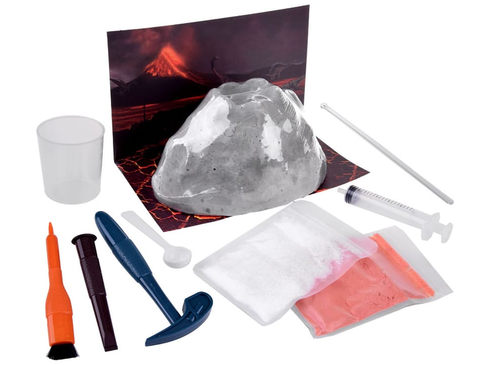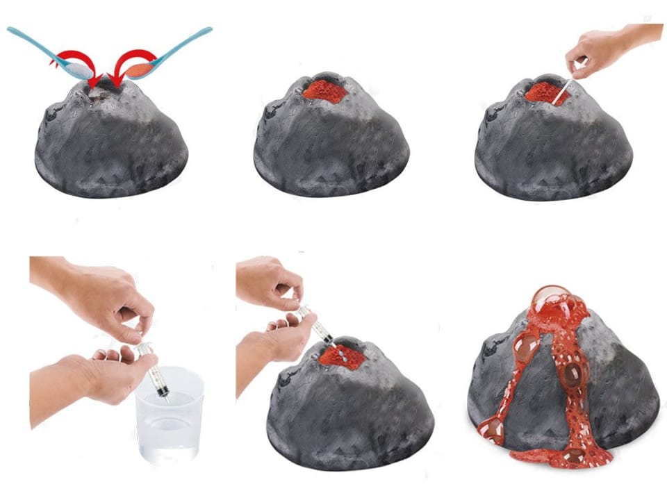 I Jak wykonać wybuch wulkanu? 1. Upewnij się, że odlew gipsowy jest suchy. W kraterze umieść nieco kwasu cytrynowego oraz wodorowęglanu sodu i wymieszaj mieszadełkiem. Im więcej składników wsypiesz, tym mocniejszy efekt zostanie osiągnięty. 2. Nalej wody do kubeczka a następnie napełnij nią strzykawkę. Następnie za pomocą strzykawki umieść wodę w kraterze wulkanu. Rób to ostrożnie, tak, by dłonie nie dotykały odlewu wulkanu. 3. Obserwuj reakcję- pojawią się bąbelki a następnie "lawa" zacznie wypływać z krateru, niczym w prawdziwym wulkanie.