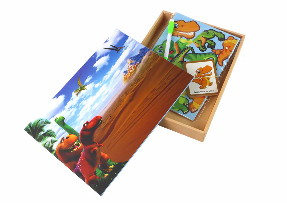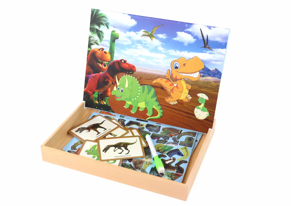 Jednak to nie wszystko. Wieczko pudełka przedstawia prehistoryczne miejsce życia dinozaurów, na której dzieci mogą tworzyć swoje własne opowieści. To miejsce, gdzie dinozaury nabierają życia, a dzieci stają się twórcami własnych, prehistorycznych historii. Dodatkowo druga strona tablicy służy jako płaszczyzna do rysowania za pomocą dołączonego pisaka, co pozwala dzieciom wyrażać siebie w sztuce.