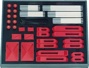 Wykonanie: zestaw z tworzywa sztucznego, składający się z 55 elementów. Łapy dociskowe, podkładki do mocowania i nakrętki z bardzo wytrzymałego tworzywa sztucznego PBT, czerwone.