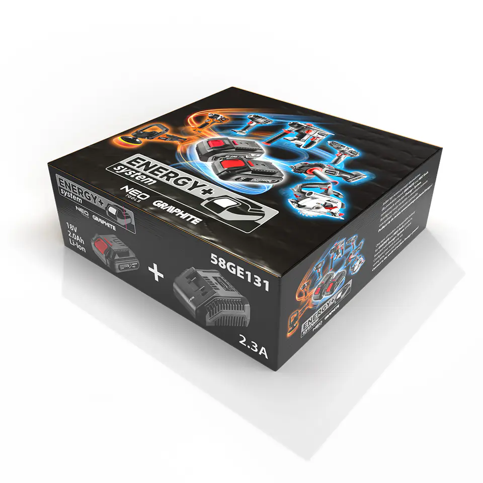 Zestaw Energy+: akumulator 2 Ah z ładowarką 58GE131 marki GRAPHITE składa się na akcesoria w nowoczesnej serii akumulatorowej Energy+. Akumulator o pojemności 2 Ah litowo-jonowy 18 V 58G001 oraz ładowarka 2,3 A 58G002 są kompatybilne ze wszystkimi elektronarzędziami Energy+ GRAPHITE i NEO. Gwarantują ładowanie bez ryzyka utraty pojemności. Posiadają wskaźnik ładowania i elektroniczny system kontroli temperatury oraz przepływu prądu podczas ładowania, a także rozładowywania. Akumulator i ładowarka posiadają certyfikat CE. Sprawdzą się zarówno w warsztacie profesjonalisty jak i majsterkowicza.