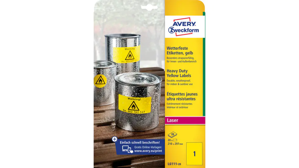 ETYKIETY HEAVY DUTY (do użytku zewnętrznego) • Niezwykle wytrzymałe etykiety samoprzylepne wykonane z żółtego poliestru. • Wyjątkowo odporne na działanie niekorzystnych warunków otoczenia - idealne do użytku zewnętrznego. • Doskonałe do oznaczania produktów, inwentaryzacji środków trwałych, czy umieszczania informacji ostrzegawczych w trudnych warunkach, np.na produkcji lub budowie. • Wodoodporne, odporne na działanie smarów, brudu i temperaturę od -20°C do +80°C. • Przeznaczone do drukarek laserowych i kopiarek. • Darmowe i łatwe w użyciu szablony oraz oprogramowanie dostępne na www.avery-zweckform.pl.