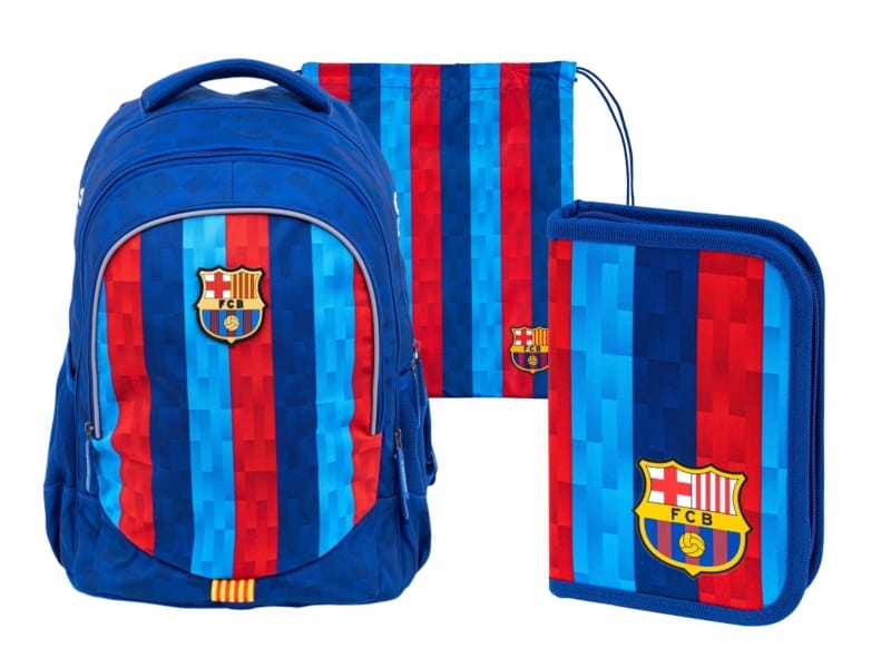 Zestaw zawiera plecak, piórnik oraz worek, wszystkie elementy utrzymane w klubowych barwach i ozdobione logo FC Barcelona.