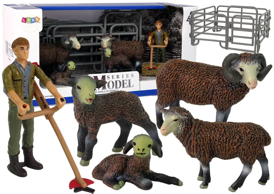 W zestawie znajdziemy Zagrodę z otwieraną furtką, rolnika z kosą spalinową, rodzinę owiec w tym dorosłą owce, barana i dwie młodziutkie owieczki oraz belę słomy.