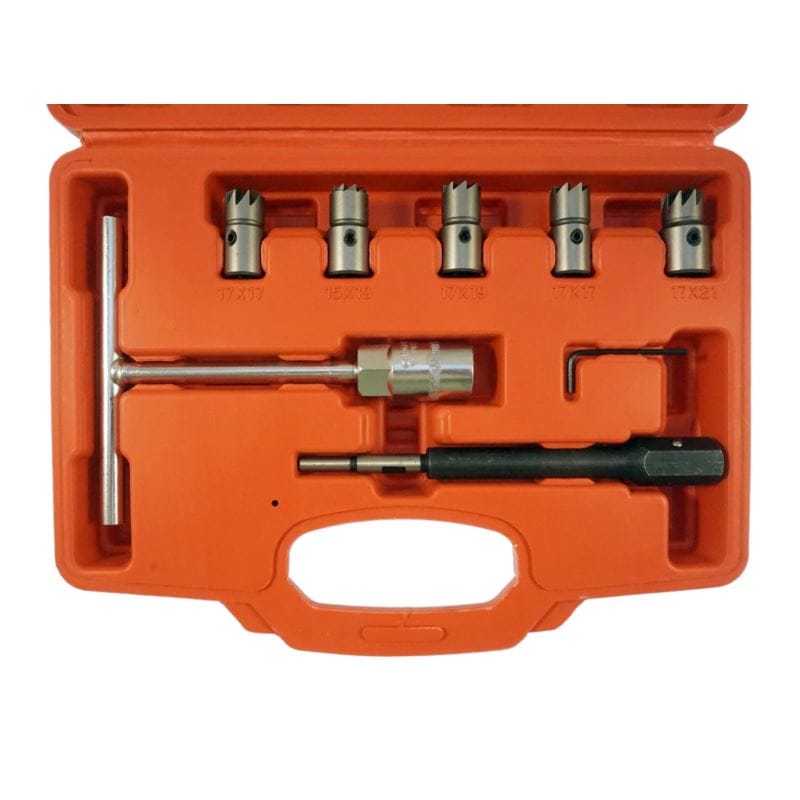 Zestaw pięciu frezów do gniazd wtryskiwaczy, wraz z trzpieniem pilotującym oraz pokrętłem.