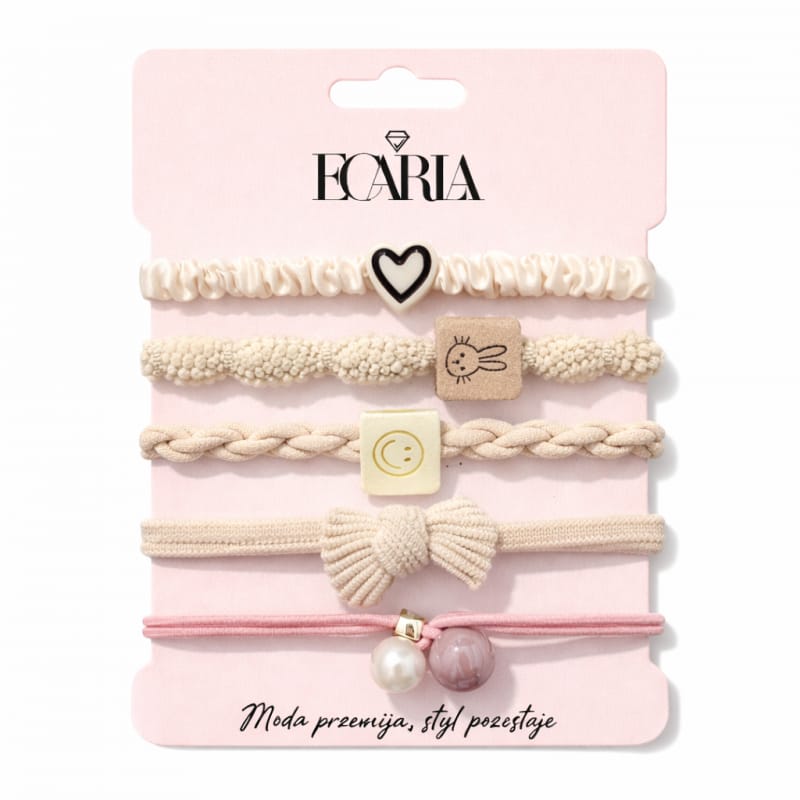 Gumki do włosów - Zestaw 5 szt.Wspaniały dodatek do włosów, który pokochają Wasze klientki. Wymiary:Średnica gumki do 9 cm Wymiary kartonika z opakowaniem:11,5 cm x 15 cm x 1,5 cm Waga: 11g netto / 21g brutto Zestaw obejmuje 5 gumek do włosów.