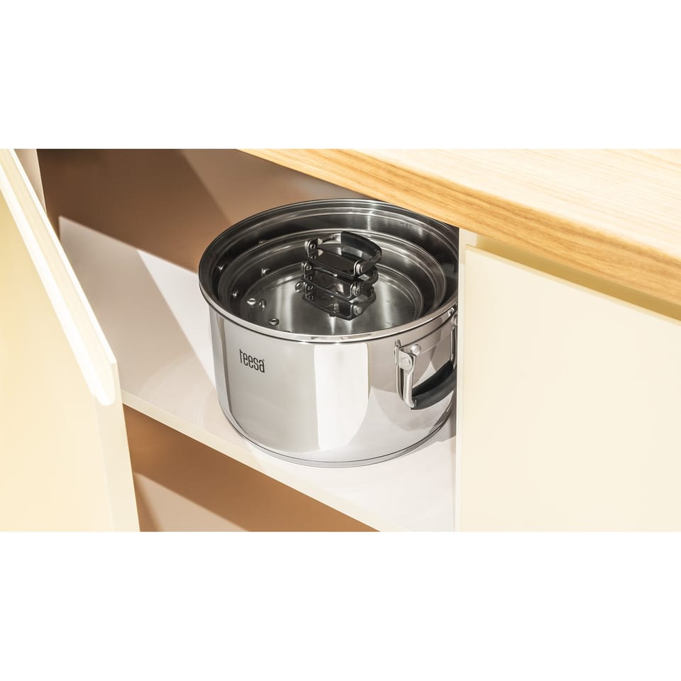 3 garnki w komplecieStal nierdzewna typ 304Pokrywki ze szkła hartowanego z odpowietrznikiemPraktyczna miarka wewnątrzNitowane składane uchwytyDo wszystkich rodzajów kuchenekProfilowane brzegiWielowarstwowe dnoSzybkie i równomierne nagrzewanie sięMożliwość mycia w zmywarceWymiary (średnica x wysokość)Garnek 2 l: O 16 x 8,5 cmGarnek 4 l: O 20 x 11,5 cmGarnek 6 l: O 24 x 14,5 cm