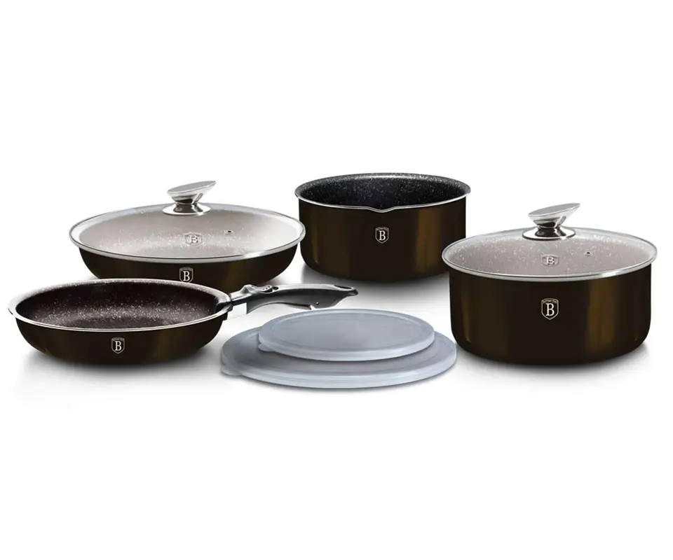 Najwyższej jakości zestaw garnków i patelni aluminiowych z unikalną powłoką granitową oraz odpinaną rączką w systemie Click it. Produkt renomowanej marki BERLINGER HAUS z linii Shiny Black Edition. Przystosowane do wszelkiego typu kuchenek, także indukcyjnych.