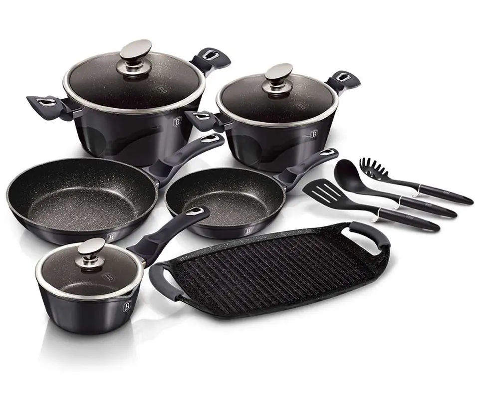 Naczynia z serii CARBON PRO firmy BERLINGER HAUS wykonane są z wysokiej klasy odlewanego aluminium pokrytego wewnątrz potrójną powłoką granitową (marble) o bardzo wysokim współczynniku twardości. Powłoka zewnętrzna w kolorze metalicznym grafitowym. Te atrakcyjne i modne naczynia wyposażone są standardowo w uchwyty typu SOFT TOUCH (silikon handle). Przystosowane do wszystkich rodzajów kuchenek: gazowa, elektryczna, ceramiczna, halogenowa, indukcyjna. System TURBO INDUCTION (bardzo szybko nagrzewają się) pozwala zaoszczędzić nawet 35% energii.