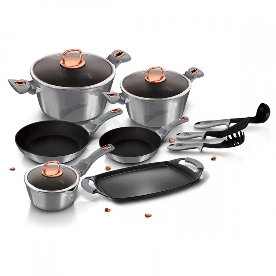 Garnki i patelnie z serii METALLIC firmy BERLINGERHAUS wykonane są z wysokiej klasy kutego aluminium pokrytego wewnątrz potrójną powłoką granitową (marble) o bardzo wysokim współczynniku twardości. Powłoka zewnętrzna występuje w kilku wersjach kolorystycznych o charakterystycznym metalicznym połysku. Te atrakcyjne i modne naczynia wyposażone są standardowo w uchwyty typu SOFT TOUCH (silikon handle). Przystosowane do wszystkich rodzajów kuchenek: gazowa, elektryczna, ceramiczna, halogenowa, indukcyjna. System TURBO INDUCTION (bardzo szybko nagrzewają się) pozwala zaoszczędzić nawet 35% energii.
