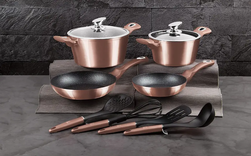 Garnki i patelnie z serii METALLIC firmy BERLINGERHAUS wykonane są z wysokiej klasy kutego aluminium pokrytego wewnątrz potrójną powłoką granitową (marble) o bardzo wysokim współczynniku twardości. Powłoka zewnętrzna występuje w kilku wersjach kolorystycznych o charakterystycznym metalicznym połysku. Te atrakcyjne i modne naczynia wyposażone są standardowo w uchwyty typu SOFT TOUCH (silikon handle). Przystosowane do wszystkich rodzajów kuchenek: gazowa, elektryczna, ceramiczna, halogenowa, indukcyjna. System TURBO INDUCTION (bardzo szybko nagrzewają się) pozwala zaoszczędzić nawet 35% energii.