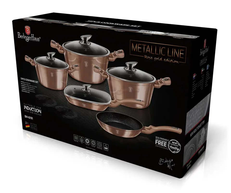 Garnki i akcesoria z serii METALLIC firmy BERLINGERHAUS wykonane są z wysokiej klasy kutego aluminium pokrytego wewnątrz potrójną powłoką granitową (marble) o bardzo wysokim współczynniku twardości. Powłoka zewnętrzna występuje w kilku wersjach kolorystycznych o charakterystycznym metalicznym połysku. Te atrakcyjne i modne naczynia wyposażone są standardowo w uchwyty typu SOFT TOUCH (silikon handle). Przystosowane do wszystkich rodzajów kuchenek: gazowa, elektryczna, ceramiczna, halogenowa, indukcyjna. System TURBO INDUCTION (bardzo szybko nagrzewają się) pozwala zaoszczędzić nawet 35% energii.
