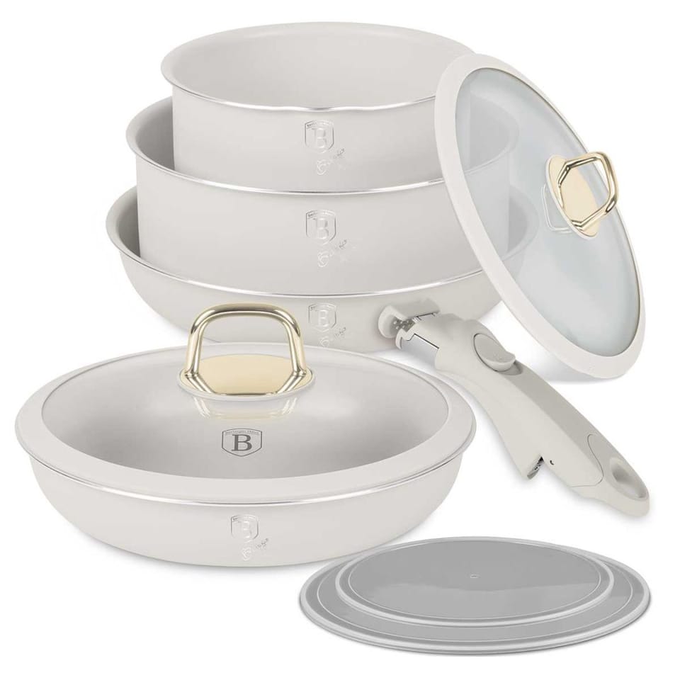 Najwyższej jakości zestaw garnków i patelni aluminiowych z potrójną powłoką tytanową TYTAN PRO oraz odpinaną rączką w systemie Click it. Produkt renomowanej marki BERLINGER HAUS z linii Sahara Collection. Przystosowane do wszelkiego typu kuchenek, także indukcyjnych. Patelnie oraz garnki posiadają wygodne, odpinane, nienagrzewające się rączki. Dzięki temu łatwo je przechowywać, można wstawić do piekarnika a w zmywarce zajmą mniej miejsca niż tradycyjne. Naczynia posiadają precyzyjnie szlifowane, płaskie dna z dyskiem ferromagnetycznym. Wpływa to na równomierne ogrzewanie potraw oraz bardzo dobre magazynowanie ciepła. System odpinanych rączek ułatwia przechowywanie naczyń. Plastikowe pokrywy w zestawie pozwalają szczelnie przykryć naczynia gdy chcemy potrawy przechowywać w lodówce.