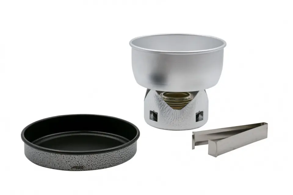 Zestaw zawiera turystyczną kuchenkę/ palnik spirytusowy Spirit Burner B25 oraz osłonę przeciwwiatrową kompatybilną z kuchenką/ piecykiem Trangia mini Stove. Poza tym aluminiowy rondel o pojemności 0,8 l i patelnię z nieprzywierającą powłoką Non Stick.