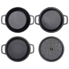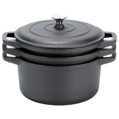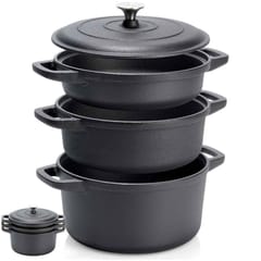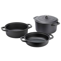 Zestaw trzech garnków o pojemności 2 l, 2,8 l i 4,3 l z jedną pokrywką w zestawie. Wykonane w całości z żeliwa. Nadają się na każdą kuchenkę w tym indukcję, do piekarnika czy na grilla.