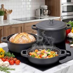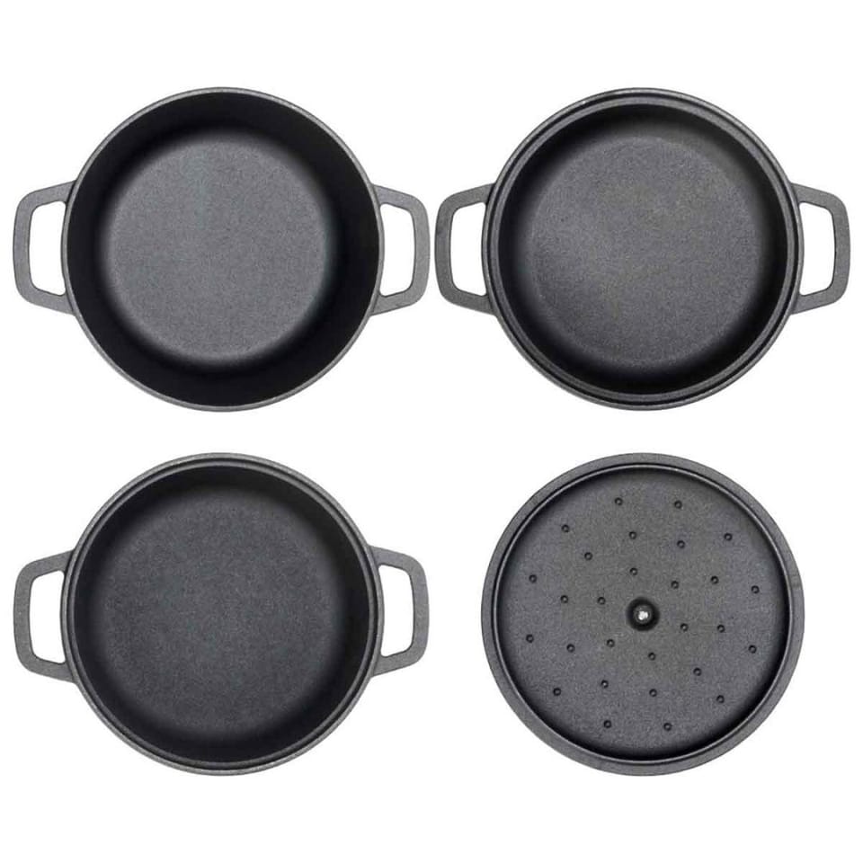 - Uniwersalne zastosowanie - Zestaw garnków żeliwnych sprawdzi się w kuchni domowej, na grillu oraz podczas kempingu. Umożliwia bezpośrednie serwowanie potraw na stół, które dzięki właściwościom żeliwa długo zachowują ciepło. Idealny do przygotowywania aromatycznych i soczystych dań.