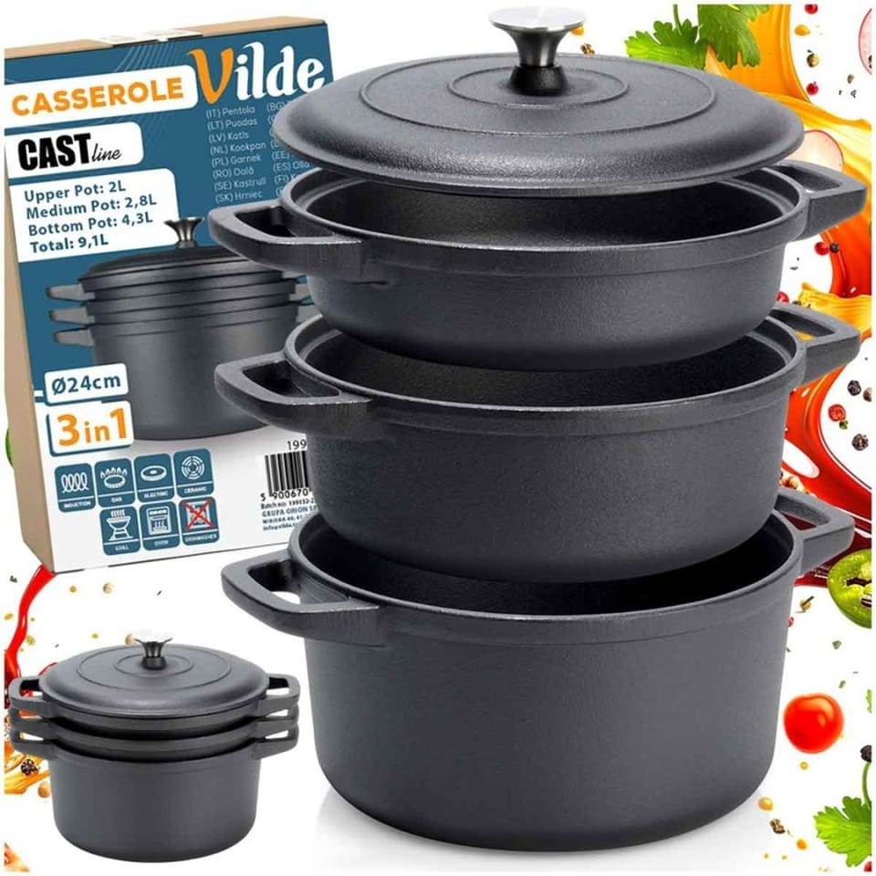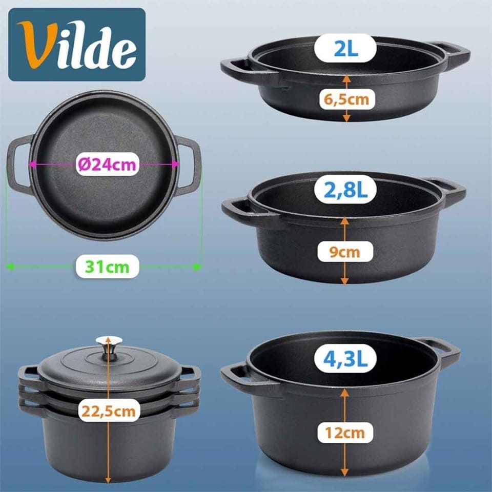 - Zestaw 3 garnków żeliwnych - Praktyczny komplet składający się z trzech garnków żeliwnych o różnej wielkości oraz jednej dopasowanej pokrywki. Zestaw idealny do przygotowywania zup, gulaszy, dań jednogarnkowych, duszonych mięs oraz zapiekanek. W zestawie garnek w formie patelni o wymiarach 31 x 24 x 6,5 cm i pojemności 2 l, garnek średni o pojemności 2,8 l i wymiarach 31 x 24 x 9 cm oraz garnek duży o pojemności 4,3 l i wymiarach 31 x 24 x 12 cm.