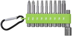 Zestaw zawiera 9 grotów udarowych i uchwyt magnetyczny. Długość grotów 50 mm. Dostarczany w oprawce z tworzywa sztucznego, z zaczepem karabinkowym.
