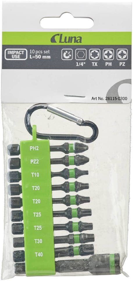 | Groty z chwytem sześciokątnym 1/4": | PH2, PZ2, TX10, TX20 (2 szt.), TX25 (2 szt.), Tx30, TX40 |