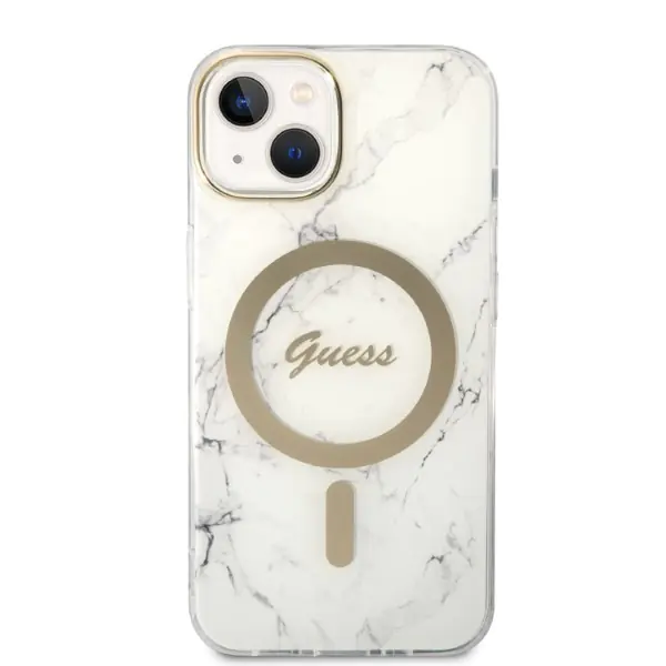 Niezwykłe efekty wizualne dostarczają złote dodatki w postaci ramki wokół aparatu i emblematu domu mody Guess. Dzięki zastosowaniu złotych dodatków etui nabiera cieplejszego charakteru. Dla jak największej wygody użytkownika etui zostało wyposażone w magnetyczny ring kompatybilny z technologią MagSafe pozwalającego na szybkie, bezprzewodowe ładowanie.