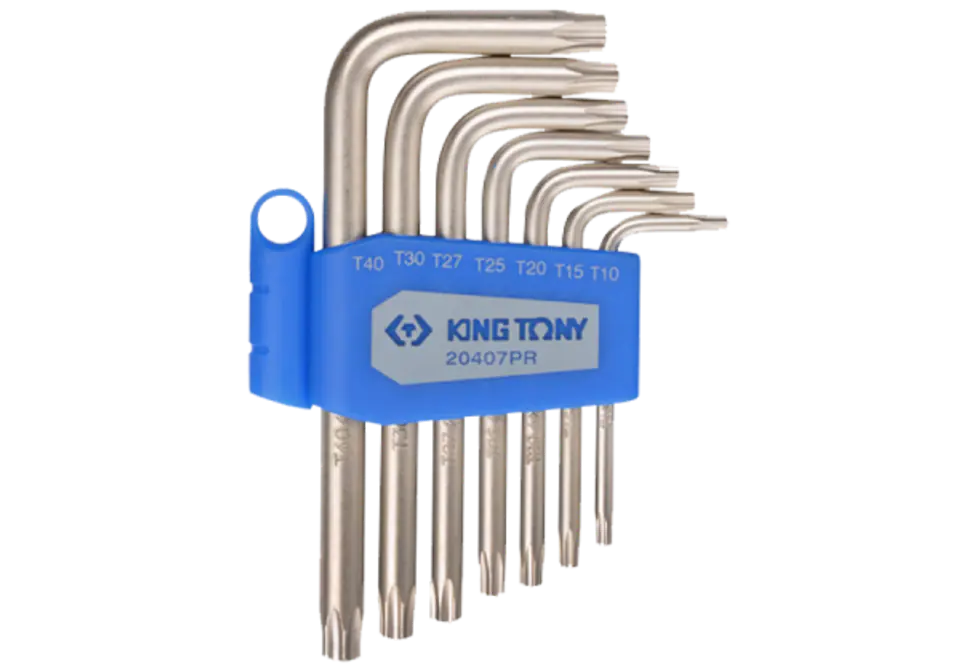 Zestaw 7 kluczy imbusowych TORX z otworem. W zestawie znajdują się klucze o rozmiarach T10, T15, T20, T25, T27, T30, T40. Zestaw w plastikowym uchwycie do powieszenia Karta produktu - 20407PR