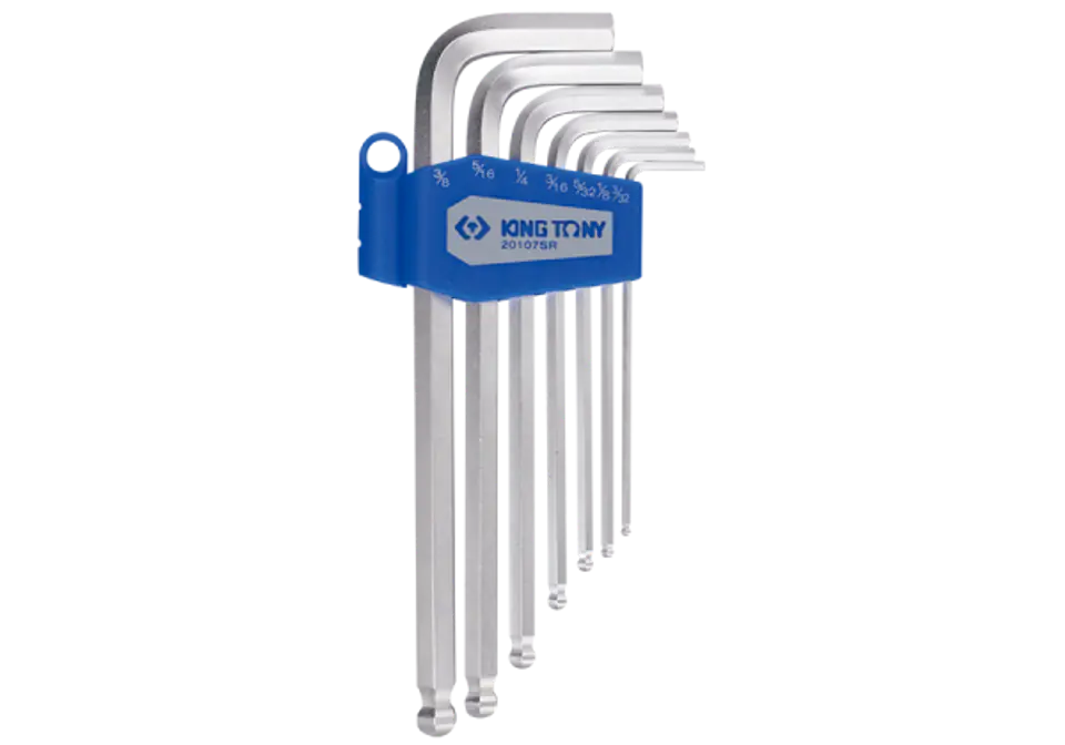 Zestaw 7 kluczy imbusowych HEX z kulką profesjonalnej marki King Tony. W zestawie znajdują się długie imbusy z serii 1130xxS w rozmiarach calowych 3/32", 1/8", 5/32", 3/16", 1/4", 5/16", 3/8". Zestaw w plastikowym uchwycie. Kulka na końcu dłuższego ramienia klucza pomaga odkręcać śruby o utrudnionym dostępie pod kątem. Karta produktu - 20107SR