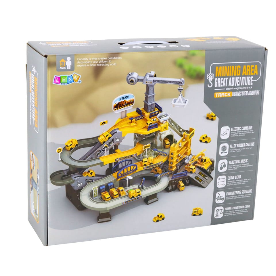 Interaktywny parking górniczy to rozbudowany zestaw zabawkowy, który przenosi dziecko w świat kopalni, maszyn budowlanych oraz realistycznych scenariuszy inżynieryjnych. Zestaw został zaprojektowany z myślą o dynamicznej i kreatywnej zabawie, łącząc elementy ruchu, dźwięku oraz mechaniki elektrycznej. Dzięki wielopoziomowej konstrukcji, torom jezdnym, rampom, dźwigowi oraz automatycznemu systemowi wspinania pojazdów dziecko może samodzielnie tworzyć rozbudowane historie i scenariusze zabawy.