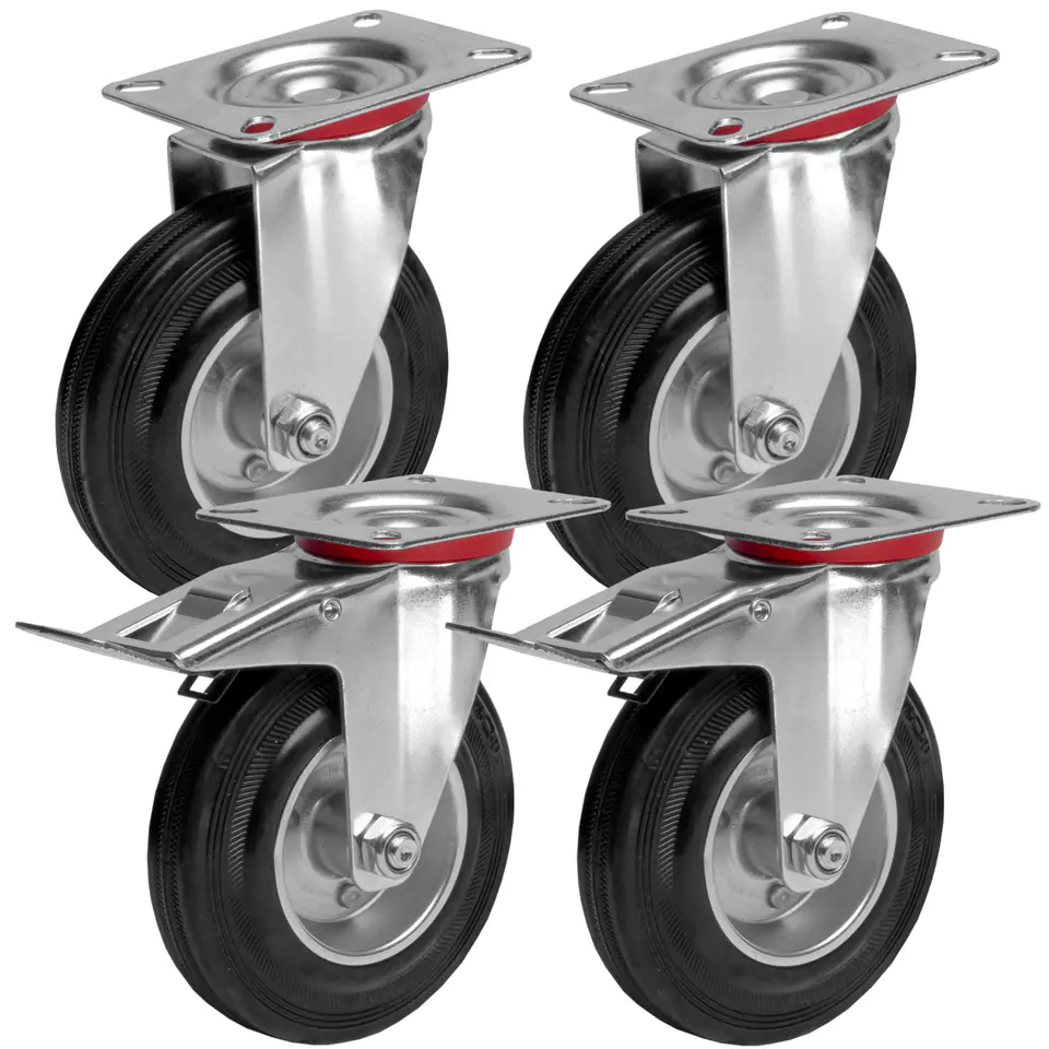 Zestaw jezdny 4 kółka MOVER meblowe 400 kg⭐W dwóch kółkach hamulce⭐Łożyskowane⭐Ciche⭐Duży udźwig 400 kg ✨Zestaw 4 kółek Mover – Najlepsze wsparcie dla Twojego mebla✨Poznaj nowy wymiar mobilności i praktyczności z zestawem 4 kółek Mover, stworzonym aby umożliwić Twoim meblom łatwe przemieszczanie się, zachowując przy tym pełną stabilność.Utworzone z najwyższej klasy materiałów, te kółka stanowią perfekcyjne rozwiązanie dla osób poszukujących komfortu i bezpieczeństwa.Dzięki zastosowaniu czarnego gumowego bieżnika, mocnej konstrukcji z matowej blachy oraz powłoki zabezpieczającej przed korozją, chromowo-cynkowej, nasze kółka zapewniają płynną nawigację oraz trwałość na lata.W pakiecie otrzymasz 4 kółka, w tym 2 z hamulcami, co zapewnia całkowitą kontrolę i stabilność mebli w miejscu ich ustawienia. Specyfikacja✅Wytrzymała konstrukcja – Widelec z matowej blachy razem z obrotową głowicą na łożyskach gwarantuje solidność i długie użytkowanie.✅Ochrona podłóg – Czarny gumowy bieżnik nie tylko umożliwia ciche i płynne przemieszczanie, ale także zabezpiecza podłogi przed porysowaniem i śladami.✅Zabezpieczenie przed korozją – Powłoka chromowo-cynkowa nie tylko podnosi walory estetyczne, ale przede wszystkim chroni kółka przed rdzą, co jest istotne w miejscach wilgotnych lub o zmiennych warunkach.✅Rozszerzona funkcjonalność – Dwie z czterech kółek wyposażone są w hamulce, co pozwala na łatwe ustabilizowanie mebli, eliminując ryzyko ich przypadkowego przesunięcia.✅Duża nośność – Maksymalna ładowność zestawu sięgająca 400 kg, umożliwia swobodne używanie nawet z cięższymi meblami i sprzętami.✅Prosty montaż – Kółka są instalowane przy użyciu płyty montażowej, co zapewnia ich szybką i łatwą instalację. Informacje dodatkowePrzedstawione kolory należy traktować poglądowo - mogą odbiegać od rzeczywistych ze względu na różne ustawienia monitorów oraz proces obróbki zdjęć. Rzeczywiste wymiary mogą się różnić od podanych wyżej. Tolerancja błędów może wynosić +/- 5%. Marka:GockowiakKod produktu:063493MGKod EAN:5905523063493Materiał:blachaPowłoka: chromowo-cynkowaBieżnik:gumowyHamulcedwaObrotowe 360 stopni:tak