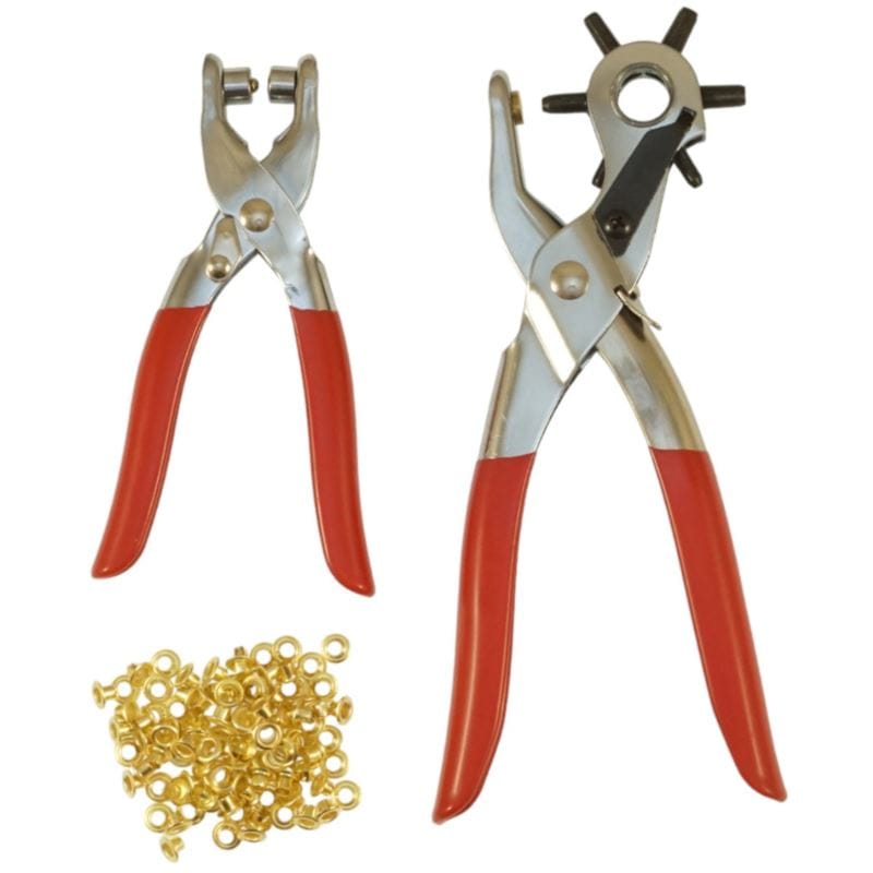 Zestaw kaletniczy: dziurkacz do pasków, szczypce kaletnicze (zaciskarka) oraz oczka. Problem czym zrobić dodatkową dziurkę w pasku lub innej części garderoby przestaje istnieć, dodatkowo powstały otwór można wykończyć oczkiem.