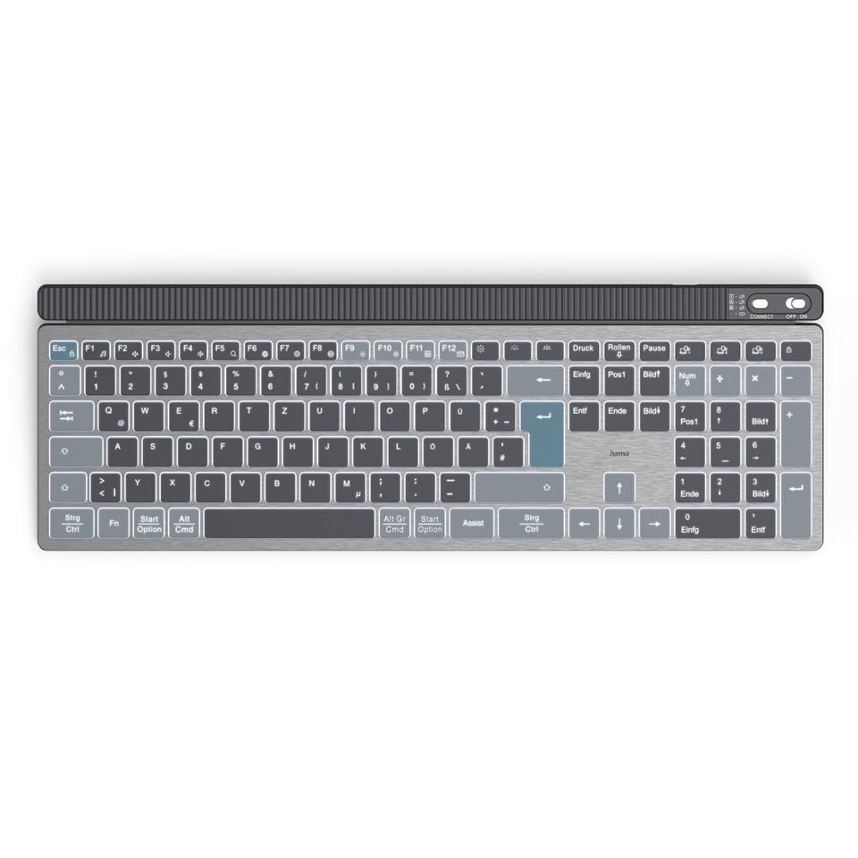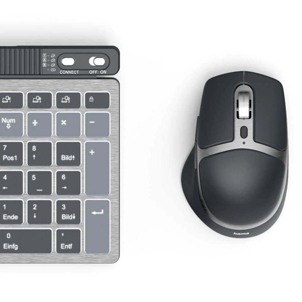 Bezprzewodowa wygoda pracy Zestaw bezprzewodowy Hama WKM-750, wykonany z aluminiowych komponentów, oferuje wszechstronną łączność multi-device, umożliwiając jednoczesne podłączenie do trzech urządzeń (1 USB, 2 Bluetooth) i szybkie przełączanie między nimi za pomocą przycisku. Stabilne połączenie 2,4 GHz oraz Bluetooth 5.2 zapewnia swobodę użytkowania na odległość do 10 metrów. Ładowanie kablem USBZarówno klawiatura, jak i myszka bezprzewodowa mają wbudowany akumulator litowo-polimerowy, zapewniając pełną mobilność i elastyczność użytkowania. Już nie musisz martwić się o częstą wymianę baterii, w pełni naładowany akumulator gwarantuje ok. 20 dni pracy klawiatury oraz aż do 90 dni pracy myszki (w zależności od użytkowania). Bezpieczeństwo danychBezpieczeństwo Twoich danych jest priorytetem. Klawiatura bezprzewodowa szyfruje wszystkie wpisywane dane za pomocą standardu AES-128, co chroni Cię przed niepożądanym dostępem i zapewnia pełną prywatność przy każdym użyciu.Sensor Blue Wave Dzięki sensorowi Blue Wave myszka bezprzewodowa doskonale sprawdza się na niemal każdej powierzchni, gwarantując precyzyjne sterowanie. Natomiast regulacja DPI w szerokim zakresie od 800 do 3200 pozwala dostosować prędkość kursora do swoich potrzeb, zapewniając optymalną precyzję.Cicha i płynna praca myszkiMyszka posiada ergonomiczną konstrukcję idealnie dopasowaną do prawej dłoni, co pozwala na komfortową pracę przez wiele godzin. Dodatkowo przyciski z technologią cichego kliknięcia zapewniają spokojne i bezgłośne użytkowanie, co jest idealne do pracy w domu lub biurze. Polimerowe ślizgacze zapewniają płynne ruchy myszki, gwarantując niezawodną i wygodną pracę na różnych powierzchniach.Ergonomia i komfortMechanizm nożowniczy w tej klawiaturze bezprzewodowej Hama zapewnia cichą pracę, idealną do domu lub biura. Regulowane podświetlenie umożliwia komfortową pracę w ciemniejszych pomieszczeniach. Natomiast składane nóżki umożliwiają dostosowanie kąta nachylenia klawiatury, co zapewnia wygodną pozycję dłoni podczas pisania. Przycisk AI Microsoft CopilotWbudowany przycisk asystenta AI Assist* pozwala na szybszy dostęp do funkcji pomocniczych Microsoft Copilot, co ułatwia korzystanie z oprogramowania. Jest to wygodne rozwiązanie dla osób ceniących sobie współpracę ze sztuczną inteligencją. *Funkcja przycisku AI dostępna po aktualizacji systemu do Microsoft Windows 11 oraz zainstalowaniu aplikacji Copilot.Klawiatura numerycznaPełnowymiarowa klawiatura bezprzewodowa z blokiem numerycznym idealnie sprawdzi się w pracy i w domu. Zapewnia wygodę podczas codziennych zadań, takich jak pisanie dokumentów czy obsługa aplikacji biurowych. Klawisze multimedialneDzięki funkcji Fn możesz łatwo zarządzać multimediami za pomocą klawiszy funkcyjnych F1-F12. Możliwość blokady Fn pozwala na szybkie przełączanie między standardowymi a multimedialnymi funkcjami klawiszy, co umożliwia bezpośredni dostęp do przydatnych opcji, takich jak regulacja głośności czy zmiana utworów, bez konieczności ciągłego przytrzymywania przycisku Fn.Efektywne zarządzanie energiąZestaw bezprzewodowy Hama WKM-750 automatycznie przechodzi w tryb uśpienia po 5 minutach bezczynności, co pomaga oszczędzać energię. Dodatkowy przełącznik On/Off (oddzielny dla myszki i klawiatury) umożliwia szybkie wyłączenie urządzenia, co pozwala jeszcze bardziej zoptymalizować zużycie akumulatora i wydłużyć jego żywotność.Ekologiczny wybórObudowa i klawisze zarówno klawiatury, jak i myszki bezprzewodowej Hama WKM-750 są wykonane w 65% z plastiku ABS pozyskanego z recyklingu. Zestaw otrzymasz w opakowaniu w 100% wolnym od plastiku, wykonanym z papieru z certyfikatem FSC, potwierdzającym odpowiedzialne zarządzanie zasobami leśnymi i zrównoważoną produkcję.Specyfikacja: