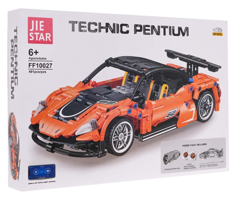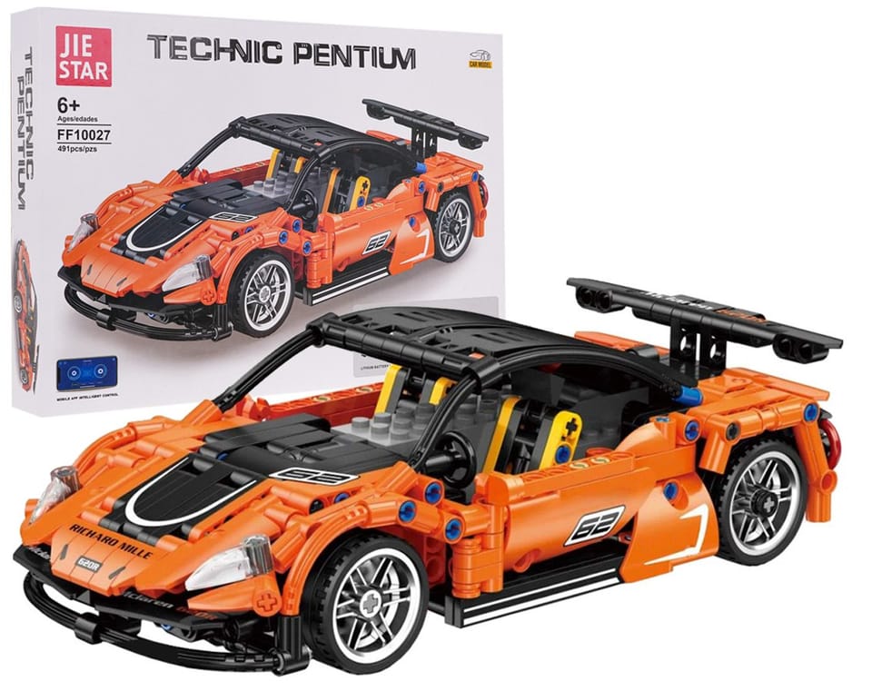 Zestaw 491 klocków konstrukcyjnych do samodzielnej budowy pomarańczowego samochodu sportowego z funkcją zdalnego sterowania. Zabawka przeznaczona dla dzieci od 6-go roku życia. Klocki i elementy autka wykonane zostały z wysokiej jakości tworzywa sztucznego. Auto posiada ruchome elementy, jak otwierane drzwi i maskę. Samochód steruje się zdalnie za pomocą pilota RC z zestawu lub dedykowanej aplikacji mobilnej. Pilot działa na niezawodnej częstotliwości 2,4 GHz. W zestawie dołączono instrukcję obrazkową. Układanie klocków konstrukcyjnych rozwija u dzieci zdolności manualne, wyobraźnię przestrzenną i cierpliwość. Autko zasilane jest akumulatorem 7,4V (w zestawie), pilot jest zasilany bateriami 2 x AAA 1,5V (brak w zestawie). Specyfikacja: - zestaw 491 klocków konstrukcyjnych, - zdalne sterowanie we wszystkich kierunkach (przód-tył-prawo-lewo), za pomocą pilota RC lub aplikacji mobilnej, - pilot działa na częstotliwości 2,4 GHz, - ręcznie otwierane drzwi i maska, - wierne odwzorowanie prawdziwego samochodu, - przeznaczony dla dzieci od 6-go roku życia, - możliwość ozdobienia auta naklejkami z zestawu, - instrukcja obrazkowa w zestawie.