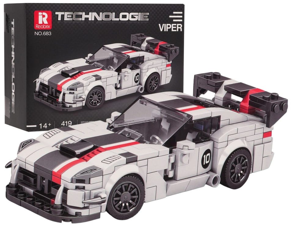 Zestaw 419 klocków konstrukcyjnych do samodzielnej budowy sportowego samochodu Viper. Zabawka przeznaczona dla dzieci od 14-go roku życia, a poziom jej trudności to 2/5. Auto posiada ręcznie otwierane drzwi. W zestawie dołączono instrukcję obrazkową. Układanie klocków konstrukcyjnych rozwija u dzieci zdolności manualne, wyobraźnię przestrzenną i cierpliwość. Specyfikacja: - zestaw 419 klocków konstrukcyjnych, - trudność złożenia na poziomie 2/5, - ręcznie otwierane drzwi, - wierne odwzorowanie prawdziwego samochodu, - przeznaczony dla dzieci od 14-go roku życia, - możliwość ozdobienia auta naklejkami z zestawu, - instrukcja obrazkowa w zestawie.