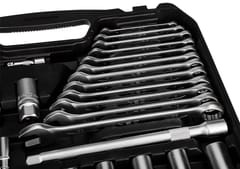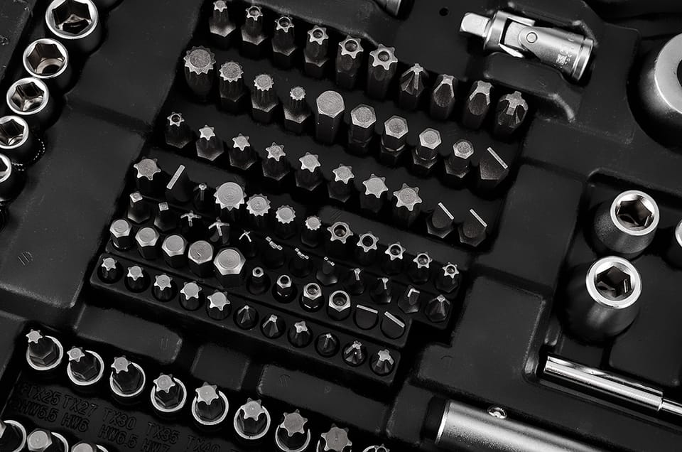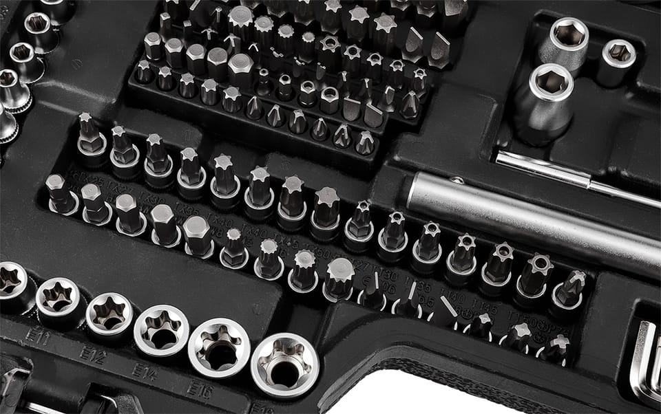 Zestaw kluczy 220 elementów 1/2", 3/8", 1/4": klucze płasko-oczkowy 12szt. Rozmiary: 8, 10, 11, 12, 13, 14, 15, 16, 17, 18, 19, 22 mm, Nasadki 1/2" 13szt. Rozmiary: 10, 11, 12, 13, 14, 15, 17, 19, 20, 21, 22, 24, 27 mm, Nasadki długie 1/2" 5 szt. Rozmiary: 16, 17, 18, 19, 22 mm, Grzechotka 1/4" 72 zęby, 155 mm, Grzechotka 1/2" 72 zęby, 255 mm, Grzechotka 3/8" 72 zęby, 200 mm, Nasadki do świec 1/2" 2szt. rozmiary: 16, 21 mm, Pokrętło z zabierakiem 1/2" 250 mm, Przegub uniwersalny 1/2", Przegub uniwersalny 3/8", Przegub uniwersalny 1/4", Przedłużki 1/2" 2szt. rozmiary: 125, 250 mm, Nasadki torx 1/2" 3 szt. rozmiary: E20, E22, E24, Nasadki do bitów 1/2" 2szt. rozmiary: T55, T60, Nasadki 3/8" 10szt. rozmiary: 10, 11, 12, 13, 14, 15, 16, 17, 18, 19 mm, Nasadki długie 3/8" 6szt. rozmiary: 10, 11, 12, 13, 14, 15 mm, Nasadki torx 3/8" 6szt. rozmiary: E10, E11, E12, E14, E16, E18, Przedłużka 3/8" 150 mm, Sześciokątna nasadka do świec zapłonowych 18 mm 3/8", Nasadki 1/4" 13szt. rozmiary: 4, 4.5, 5, 5.5, 6, 7, 8, 9, 10, 11, 12, 13, 14 mm, Nasadkik długie 1/4" 7szt. rozmiary: 4, 5, 6, 7, 8, 9, 10 mm, Nasadki torx 1/4" 5szt. rozmiary: E4, E5, E6, E7, E8, Pokrętło z zabierakiem 1/4" 150 mm, Przedłużka 1/4" 2szt. rozmiary: 50, 100 mm, Uchwyt do końcówek 3szt. rozmiary: 1/4"&1/4", 3/8"&5/16, 1/2"&5/16", Klucze imbusowe 7szt. rozmiary: 1.27, 1.5, 2, 2.5, 3, 4, 5 mm, Magnetyczny uchwyt obrotowy na małe bity , Bity 5/16" 30szt. rozmiary: H5.5, H6, H6.5, H7, H8; M5, M6, M8, M10; T25, T27, T30, T35, T40, T40, T45, T50; T27H, T30H, T35H, T40H, T45H, T50H; PH3, PH4; PZ3, PZ4; SL6, SL6.5, SL8, Bity 1/4" 44szt. rozmiary: H5.5, H6, H6.5, H7, H8; M5, M6, M8, M10; T25, T27, T30, T35, T40, T45; T27H, T30H, T35H, T40H, T45H; PH1, PH2, PH3; PZ1, PZ2, PZ3; SL6, SL6.5, SL8; H3H, H4H, H5H, H6H; ()S1-S2 (4-6-8mm (x)6-8-10mm (Y)1-2-3mm, Nasadki do bitów 1/4" 30szt. rozmiary: T25, T27, T30, T35, T40, T40 T45, T50; T27H, T30H, T35H, T40H, T45H, T50H; PH3, PH4 PZ3, PZ4; SL6, SL6.5, SL8; M5, M6, M8, M10; H5.5, H6, H6.5, H7, H8, adaptery do wkrętarki na nasadki 3 szt. rozmiary: 1/4", 3/8", 1/2", adapter do wkrętarki na bity