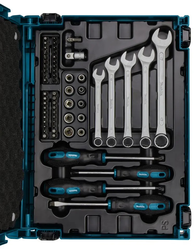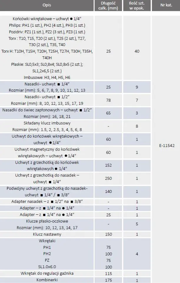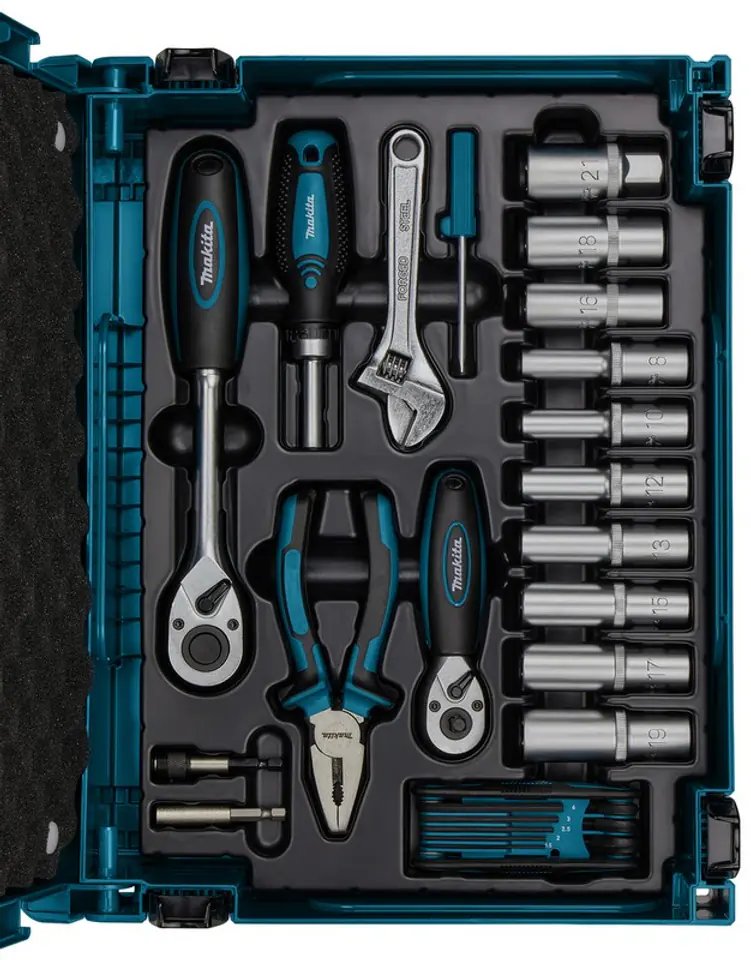 ZAWARTOŚĆ:Końcówki wkrętakowe – uchwyt 1/4”Philips: PH1 (1 szt.), PH2 (4 szt.), PH3 (1 szt.)Pozidriv: PZ1 (1 szt.), PZ2 (3 szt.), PZ3 (1 szt.)Torx : T10, T15, T20 (2 szt.), T25 (2 szt.), T27,T30 (2 szt.), T35, T40Torx H: T10H, T15H, T20H, T25H, T27H, T30H, T35H,T40HPłaskie: SL0,5x3 SL0,8x4 SL0,8x5 (2 szt.)SL1,2x6,5 (2 szt.)Imbusowe: H3, H4, H5, H6Nasadki - uchwyt ¦ 1/4”Rozmiar (mm): 5, 6, 7, 8, 9, 10, 11, 12, 13Nasadki - uchwyt ¦ 1/2”Rozmiar (mm): 8, 10, 12, 13, 15, 17, 19Nasadki do świec zapłonowych – uchwyt ¦ 1/2”Rozmiar (mm): 16, 18, 21Składany klucz imbusowyRozmiar (mm): 1.5, 2, 2.5, 3, 4, 5, 6, 8Uchwyt do końcówek wkrętakowych –uchwyt 1/4”Uchwyt magnetyczny do końcówekwkrętakowych – uchwyt 1/4”Uchwyt z grzechotką do końcówekwkrętakowych 1/4”Uchwyt z grzechotką do nasadek –uchwyt ¦ 1/4”Podwójny uchwyt z grzechotką do nasadek -uchwyt ¦ 1/4” / ¦ 3/8”Adapter nasadek – z ¦ 1/2” na ¦ 3/8”Adapter – z ¦ 1/4” na 1/4”Adapter – z ¦ 1/4” na 1/4”Klucze płasko-oczkoweRozmiar (mm): 10, 12, 13, 14, 17Klucz nastawnyWkrętakiPH1PH2PZSL1.0x6.0Wkrętak do regulacji gaźnikaKombinerkiZestaw akcesoriów i narzędzi ręcznych Makpac, 87 szt.E-11542Zestaw MakitaWszechstronne narzędzia ręczne (nasadki, klucze, śrubokręty)**
