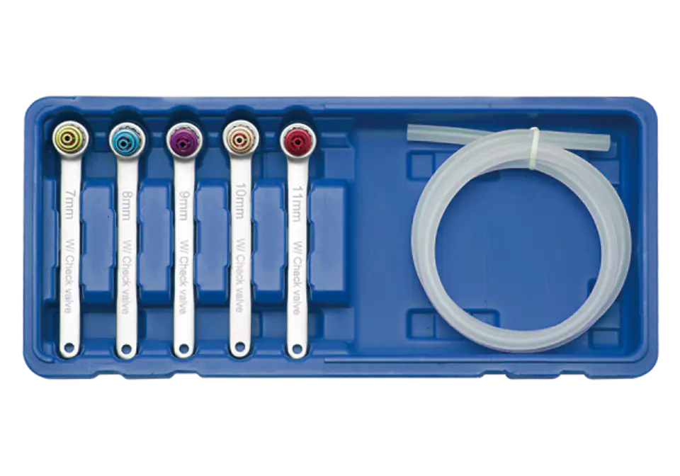 Zestaw do odpowietrzania układu hamulcowego i hydraulicznego układu sprzęgła bez zdejmowania kół* Rozmiary kluczy: 7, 8, 9,10, 11 mm.* Rurka silikonowa ma właściwości odporne na kwasy i zasady, odporność na korozję oraz na wysokie i niskie temperatury* Klucz nasadowy do odpowietrzania hamulca zapobiega cofaniu się powietrza do układu hamulcowego Karta produktu - 9BC5001MR