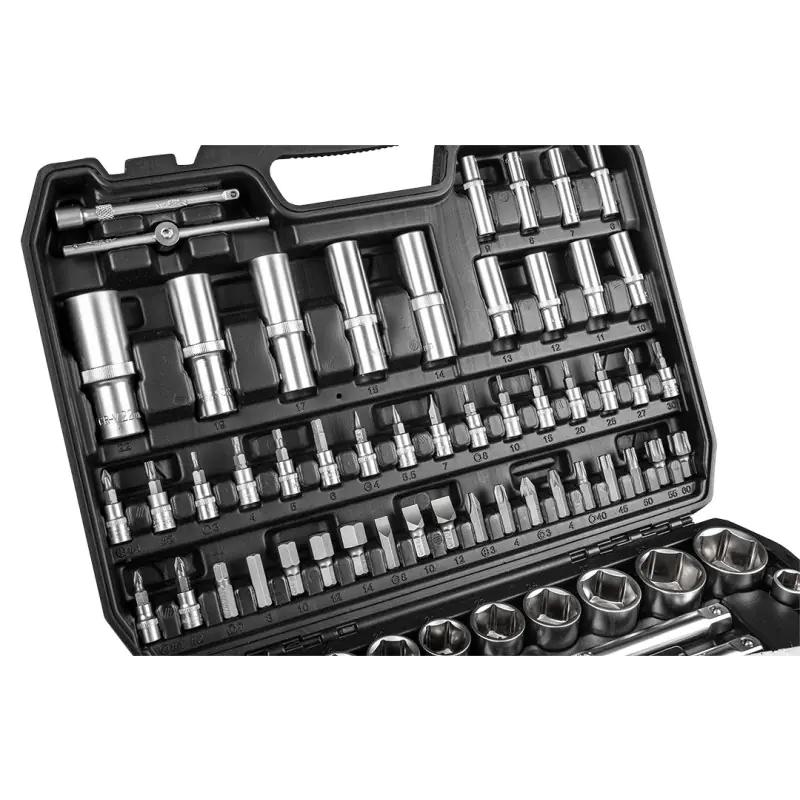 Zestaw zawiera: nasadki sześciokątne 1/2" 17 szt.: 10, 11, 12, 13, 14, 15, 16, 17, 18, 19, 20, 21, 22, 24, 27, 30, 32 mm, nasadki długie sześciokątne 1/2" 5 szt.: 14, 15, 17, 19, 22 mm, grzechotka 1/2", 72 zęby 255 mm, przedłużka 1/2" 2 szt.: 125 mm i 250 mm, nasadki do świec 1/2" 2 szt.: 16 mm i 21 mm, adapter do bitów 1/2" - 5/16", redukcja F3/8" x M1/2", przegub kardana 1/2", nasadka torx 1/2" 8 szt.: E10, E12, E14, E16, E18, E20, E22, E24 nasadki sześciokątne 1/4" 13 szt.: 4, 4.5, 5, 5.5, 6, 7, 8, 9, 10, 11, 12, 13, 14 mm nasadki długie sześciokątne 1/4" 8 szt.: 6, 7, 8, 9, 10, 11, 12, 13 mm L=50 mm nasadki torx 1/4" 5 szt.: E4, E5, E6, E7, E8 grzechotka 1/4" 72 zęby 155 mm, pokrętło przesuwne 1/4" 115 mm, przegub kardana 1/4", przedłużki 1/4" 2 szt.: 50mm i 100mm, uchwyt wkrętakowy 1/4" 150 mm, bity 5/16" 17 szt.: T40, T45, T50, T55, T60, H7, H8, H10, H12, H14, PH3, PH4, PZ3, PZ4, płaski 8, 10, 12 mm