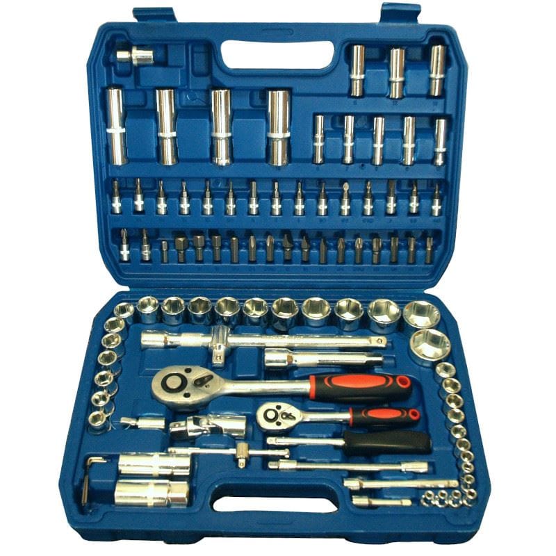 Profesjonalny zestaw kluczy nasadowych, wykonanych ze stopu chromowo-wanadowego, z grzechotkami 1/2" i 1/4" (24 zęby), kardanem i przedłużkami.