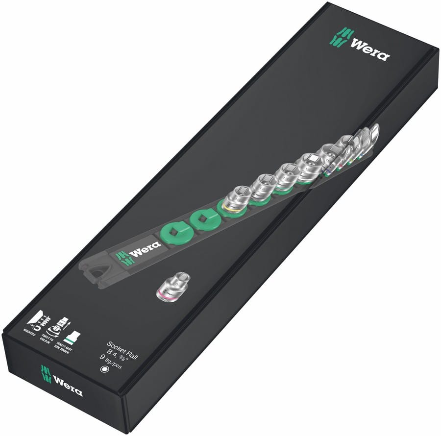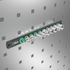 Listwa magnetyczna z 9 kluczami nasadowymi do mocowania ręcznego i maszynowego (non-impact), 3/8". Płynnie działający mechanizm obrotowy dla pewnego mocowania i łatwego wyjmowania kluczy nasadowych. System oznaczenia kolorystycznego kluczy według rozmiaru "Take it easy" ułatwiający i przyspieszający odnajdywanie właściwego narzędzia. Listwa magnetyczna umożliwia krótkotrwałe mocowanie do metalowych powierzchni, a dzięki funkcji twist to unlock zapewnia bezpieczne blokowanie i odblokowywanie kluczy nasadowych.