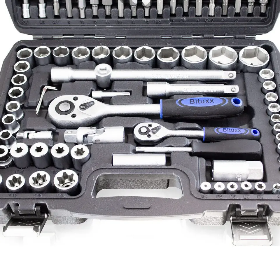 17x 1/2"Nasadki: 10, 11, 12, 13, 14, 15, 16, 17, 18, 19. 20, 21, 22, 24, 27, 30 32mm 8x 1/2" Torx: EI0, 11, 12, 14, 16, 18, 20, 24mm 5x 1/2" Nasadki długie: 14, 15, 17, 19, 22mm 2x 1/2" Nasadki do świec:16mm & 21mm 2x 1/2" Przedłużki:5" & 10" 18x 1/4" Nasadka:SL4, 5.5, 6.5, PH, 2 PZ1, 2 HEX3, 4, 5, 6, T8, 10, 15, 20, 25, 27, 30 13x 1/ 4" Nasadki: 4, 4.5, 5, 5.5, 6, 7, 8, 9, 10, 11, 12, 13, 14mm 8x 1/4" Nasadki długie: 6, 7, 8, 9, 10 11, 12, 13mm 5x 1/4" Torx: E4, 5, 6, 7, 8 2x 1/4" Przedłużki: 2" & 4" 1x 1/4" Klucz typu T 1x 1/4" śrubokręt typu Steckgriff 6" 2 x Grzechotki: 1/4" & 1/2" 2x Przeguby: 1/4" & 1/2" 1x Adapter 3-drożny 17x BitySL8, 10, 12 T40, 45, 50, 55, 60 PH3, 4 Pz3, 4 HEX7, 8, 10, 12, 14 3x Imbus: 1.5, 2, 2.5mm 1x Uchwyt na bity 1x Walizka