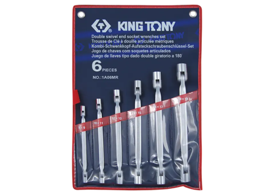 Zestaw profesjonalnych kluczy nasadowych przegubowych firmy King Tony. Zestaw w etui ze wzmacnianymi uchwytami do powieszenia na ścianie warsztatu. W skład zestawu wchodzi 6 kluczy o rozmiarach [ mm ] 8x9, 10x11, 12x13, 14x15, 16x17, 18x19 Karta produktu - 1A06MR