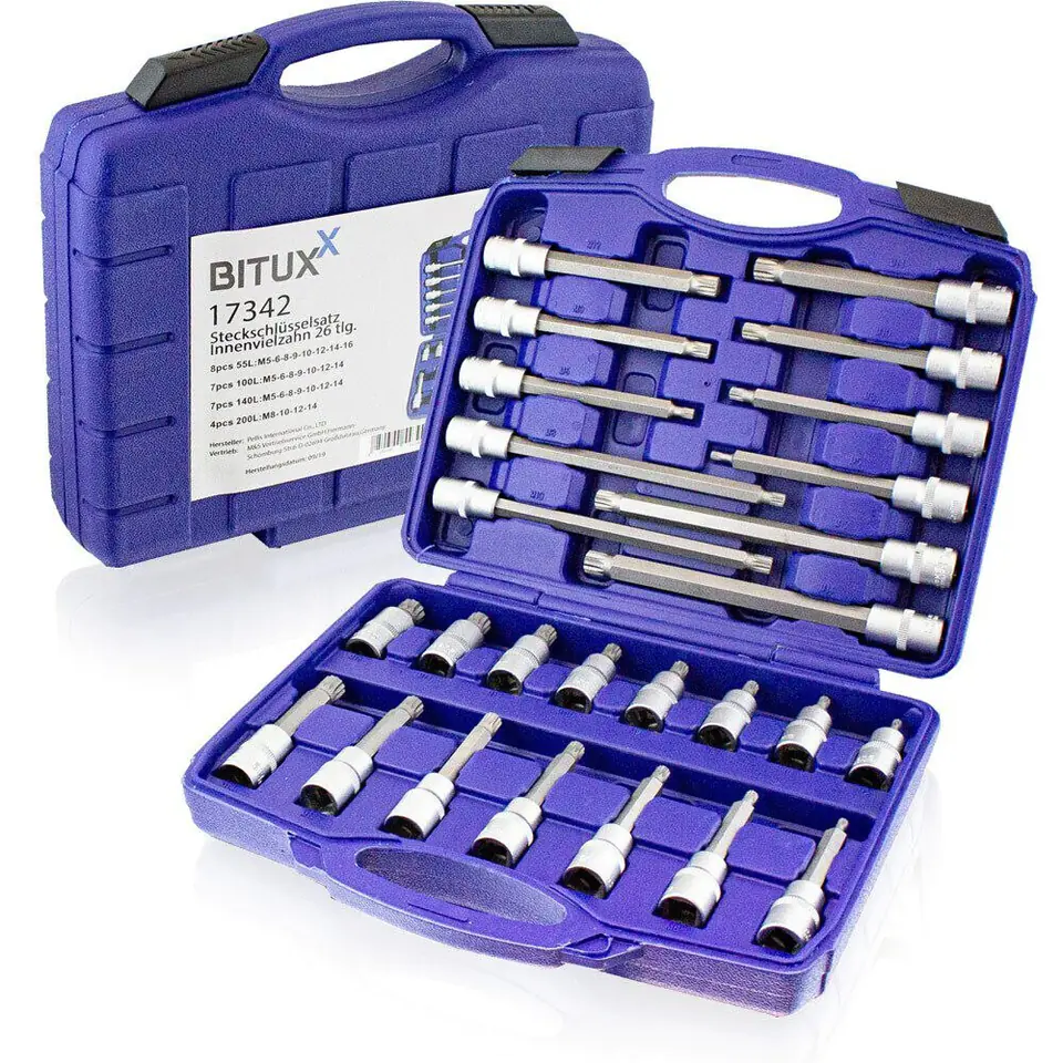 - 8 kluczy nasadowych o długości 55 mm, w rozmiarach M5, M6, M8, M9, M10, M12, M14 i M16;