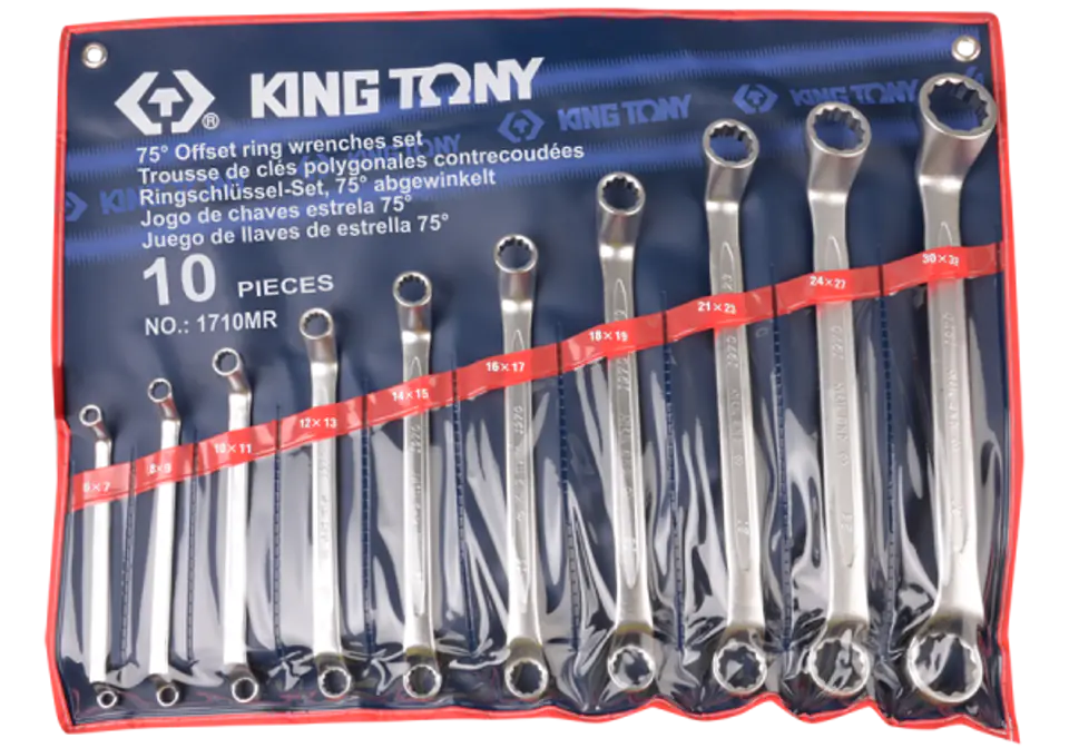 Zestaw kluczy oczkowych odgiętych o 75 stopni, 10 sztuk, firmy King Tony. W komplecie znajdują się klucze 6x7, 8x9, 10x11, 12x13, 14x15, 16x17, 18x19, 21x23, 24x27, 30x32. Zestaw narzędzi dostarczany w etui do powieszenia na ścianie Karta produktu - 1710MR