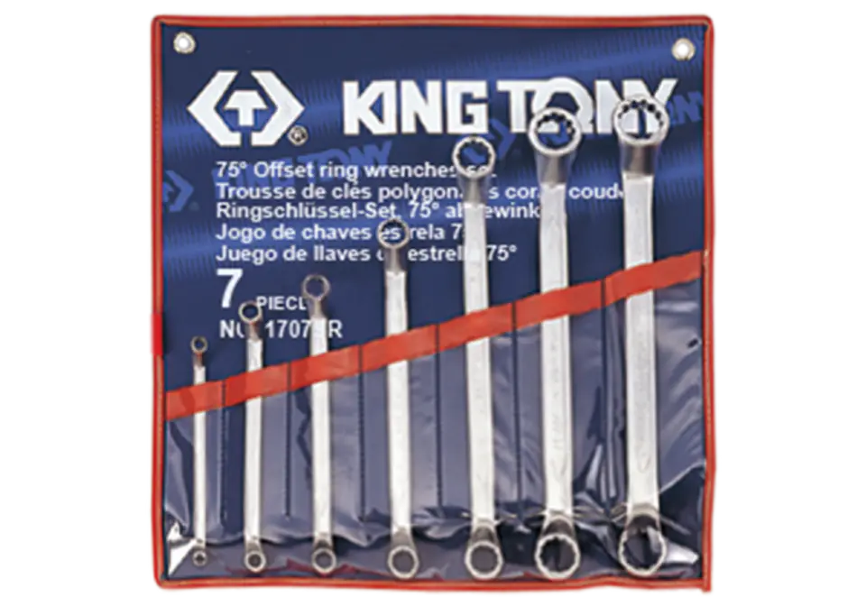 Zestaw profesjonalnych kluczy oczkowych odgiętych o 75 stopni, firmy King Tony, rozmiary calowe. Zestaw w etui do powieszenia na ścianie. W komplecie narzędzi znajduje się 7 kluczy o rozmiarach 1/4" x 5/16", 3/8" x 7/16", 1/2" x 9/16", 5/8" x 11/16", 3/4" x 7/8", 15/16" x 1", 1-1/16" x 1-1/8". Karta produktu - 1707SR