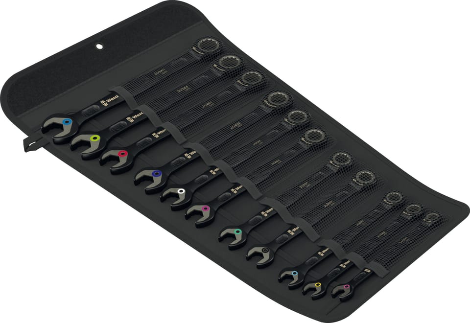 11-częściowy zestaw kluczy płasko-oczkowych z grzechotką firmy Wera. Do śrub z łbem sześciokątnym i nakrętek sześciokątnych. Z funkcją przytrzymywania dzięki metalowej płytce w szczęce, która zmniejsza ryzyko zgubienia nakrętek i śrub. Bardzo twarde ząbki wymiennej metalowej płytki pewnie chwytają śruby i nakrętki i zmniejszają ryzyko ześlizgnięcia. Wbudowany ogranicznik zapobiega ześlizgiwaniu się klucza z łba śruby i umożliwia przenoszenie wysokich momentów obrotowych. Podwójny profil sześciokątny zapewnia doskonałe połączenie kształtowe między kluczem a śrubą czy nakrętką, zmniejszając tym samym ryzyko ześlizgiwania. Kąt pracy wynoszący zaledwie 30° eliminuje czasochłonne obracanie klucza. Drobnozębny mechanizm zapadkowy z 80 zębami zapewnia maksymalną elastyczność nawet w wąskich przestrzeniach. Przenoszenie wysokich momentów obrotowych i większa wytrzymałość na zginanie dzięki specjalnej geometrii. Z wysokowydajnej stali chromowo-molibdenowej z powierzchnią wysokiej jakości, wytrzymałą, matową, chromowan