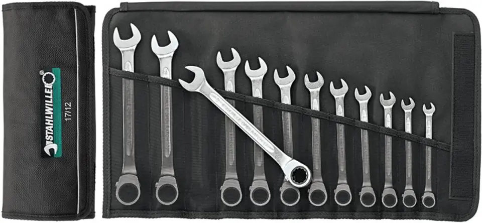 Zestawy: OPEN-RATCH klucze plasko-oczkowe z grzechotka w zwijanym pokrowcu 12-czesc