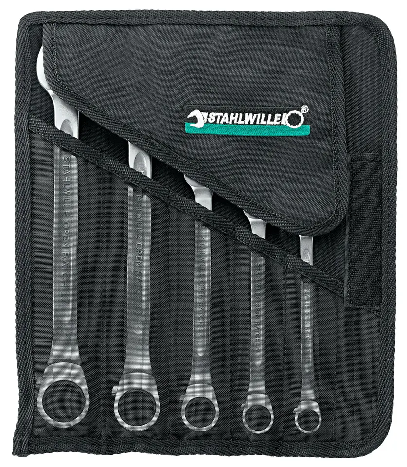 Zestawy: OPEN-RATCH klucze plasko-oczkowe z grzechotka w zwijanym pokrowcu 5-czesc