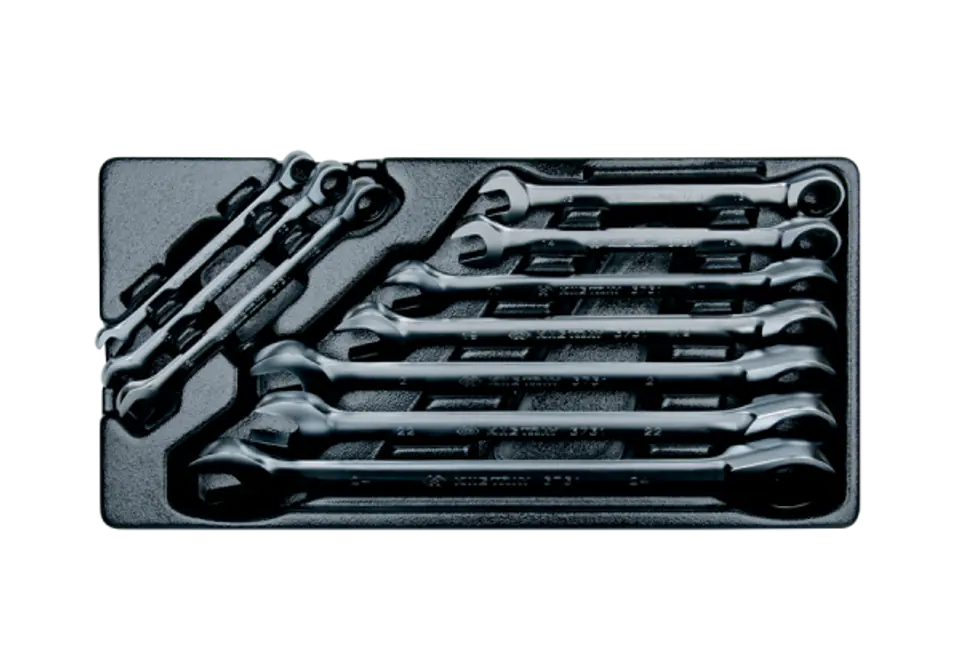 ZESTAW 10cz. KLUCZY PŁASKO-OCZKOWYCH Z GRZECHOTKĄ 8 - 24mm, WKŁAD DO WÓZKA. W zestawie klucze w rozmiarach 8, 10, 12, 13, 14, 17, 19, 21, 22, 24 mm.