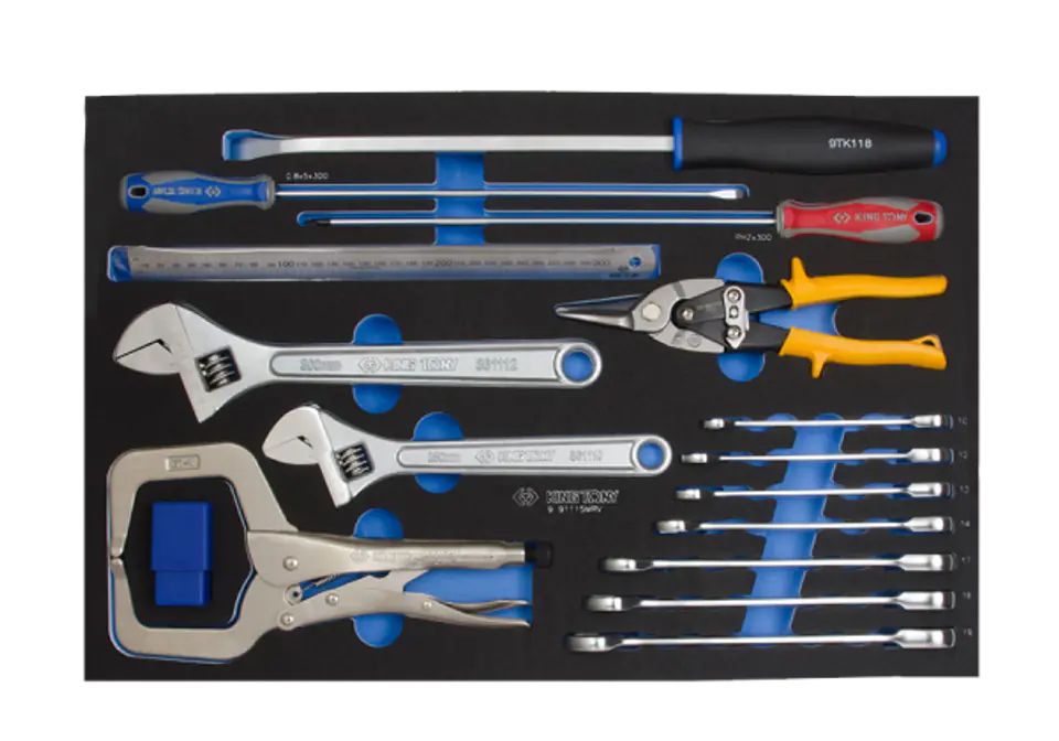 ZESTAW KLUCZY PŁASKO-OCZKOWYCH Z GRZECHOTKĄ + AKCESORIA 24cz., WKŁAD Z PIANKI EVA DO WÓZKA King Tony