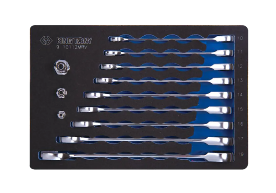 Zestaw kluczy płasko-oczkowych z grzechotką jednokierunkową. Wkład piankowy pasujący do wózków warsztatowych King Tony. W zestawie znajdują się klucze 3731M w rozmiarach 10, 11, 12, 13, 14, 15, 16, 17, 19 oraz 3 uchwyty do nasadek, które umożliwiają zmianę odpowiednich kluczy z zestawu w proste grzechotki. Karta produktu - 9-10112mrv