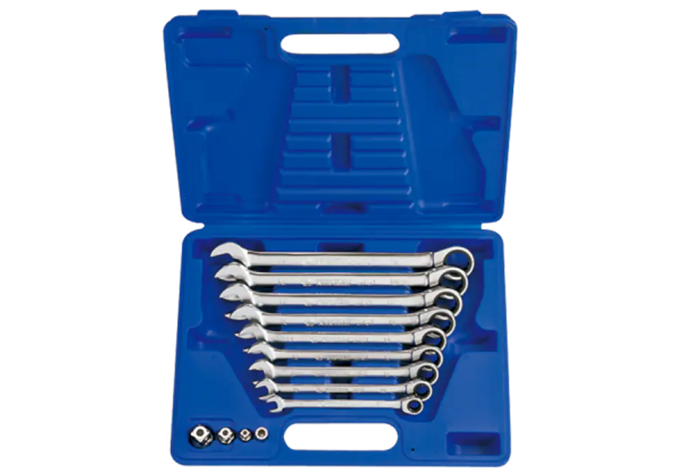 Zestaw kluczy płasko-oczkowych firmy King Tony z grzechotką jednostronną. Klucze te posiadają normalną końcówkę płaską oraz końcówkę oczkową wyposażoną w mechanizm grzechotki jednostronnej. Dzięki temu odkręcanie trudno dostępnych śrub staje się dużo łatwiejsze. W skład zestawu wchodzą klucze o rozmiarach : 8, 10, 12, 13, 14, 16, 17, 18, 19 [ mm ]. Zestaw w wytrzymałym, poręcznym plastikowym etui. W zestawie znajdują się także dodatkowe końcówki, które umożliwiają używanie kluczy jako grzechotki 1/4", 3/8" oraz 1/2", a także uchwyt do bitów. Karta produktu - 13113MR
